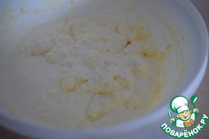 Маргарин должен быть комнатной температуры. Маргарин растереть со сметаной и ванильным сахаром. Я это действо проделывала руками. Нужно добиться однородной, без кусочков маргарина, субстанции.