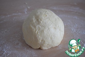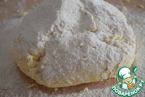 У меня ушло менее двух стаканов муки. Вот какой колобок получается. Накроем его плёнкой и отложим в сторону.