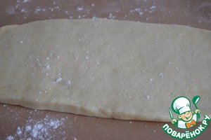 Отрезаем от теста половину. Скатываем колбаску и затем раскатываем из неё прямоугольник размером 15х30 см. -