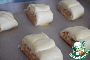 Смазываем взбитым яйцом и отправляем выпекаться в предварительно нагретую духовку (200 градусов) на 25-30 минут. Рулетики должны красиво зарумяниться.