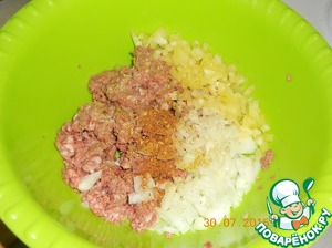 Фарш смешать с, мелко порезанным, луком и перцем. Посолить. Добавить приправу
