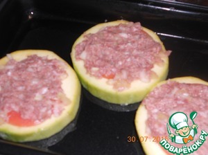 Кабачок порезать кругляшками толщиной 1-1,5 см и убрать серединку. Посолить и оставить на 10 мин. Разложить колечки на противень. В середину положить немножко фарша