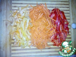 Перец (у меня было по половинке двух разных перцев) и морковь почистить, нарезать соломкой.