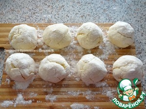 Обваливая в муке, сформировать шарики, размером с куриное яйцо;