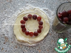 Взять один шарик раскатать в круг, подходящими стаканами сделать разметку будущего кольца, разложить крыжовник в середину, разрезая его пополам;