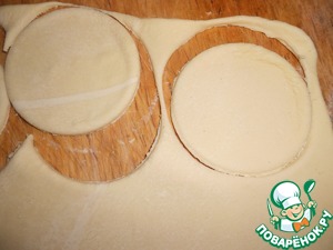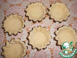 Формочки для кексов смазать растительным маслом и выстлать кружочками слоеного теста. Дно теста наколоть вилкой. Выпекать в духовке при температуре 190 градусов в течении 20-25 минут.