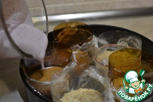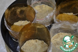 "стаканчики" устанавливаем в любую удобную емкость, ( у меня это разъемная форма), укладываем смесь печенья с маслом в стаканчики, уплотняем ее пальцами или ложкой и убираем в холодильник.