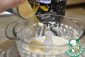 Творог отдельно перетираем (я делаю это в измельчителе), что бы он стал однородным, затем добавляем сливки, сахар, взбиваем до однородности.