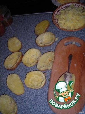 Разрежьте картофель пополам и извлеките мякоть (я использую чайную ложку). Соедините ее с маслом и молоком, приправьте специями и растолчите в пюре.