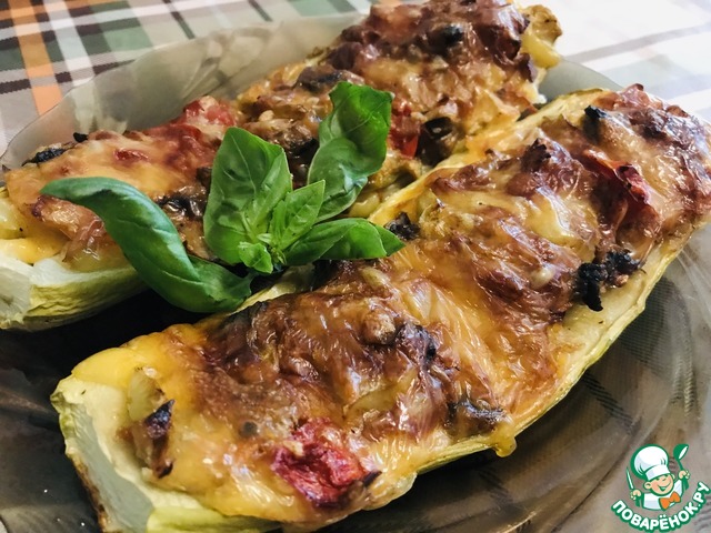 10. Помещаем кабачки в форму, наполняем овощами, а сверху посыпаем сыром.