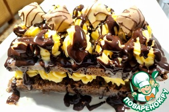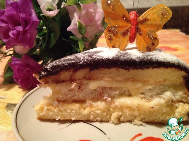 Берем один бисквитный корж. покрываем его половиной крема, накрываем кокосовым коржом и покрываем оставшимся кремом. Сверху накрываем вторым бисквитным коржом и выкладываем глазурь, давая ей растечься, чуть помогая лопаткой.