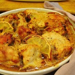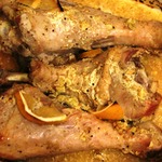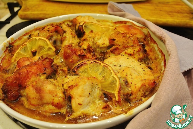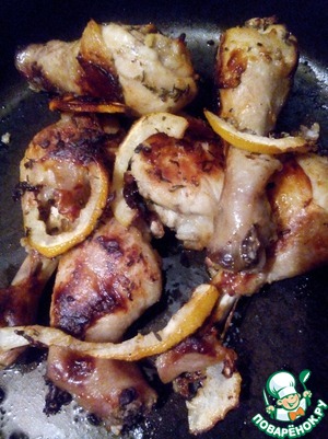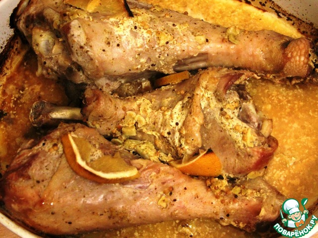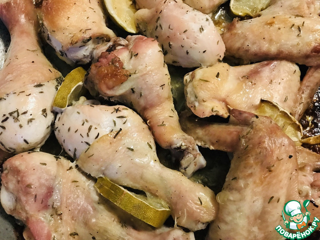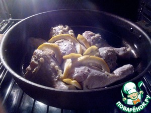 По истечении часа, выкладываем в форму смазанную растительным маслом. Ставим в духовку при 200 градусах на час. Еще я положила между голенями кусочки лимона.