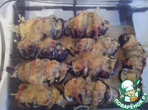 Фаршируем наши баклажаны-в надрезы помещаем овощи и сыр в произвольном порядке. У меня получилось вот так.