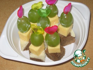 Канапе дамские - хлеб "Тигренок", сыр топленое молоко, виноград.