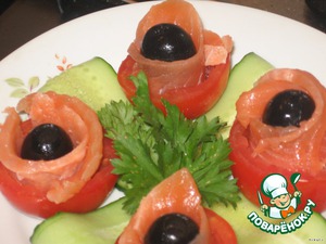 Нужны небольшие помидорчики (немного больше черри). Аккуратно срезать верхушку, ложечкой вынять мякоть, немного соли, перца, капелька оливкового масла. Маслинку или оливку закручиваем в тонкий ломтик красной рыбы (соленой или подкопченной), вставляем в помидорчик (по желанию можно добавить немного майонеза в помидор, но и без него очень вкусно, и ничего не течет. Украсить зеленью, огурчиком. Такая закусочка просто исчезает со стола. -