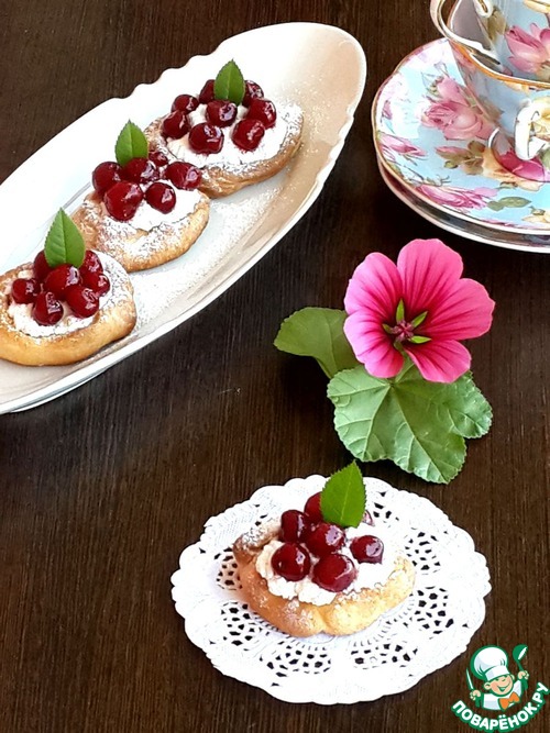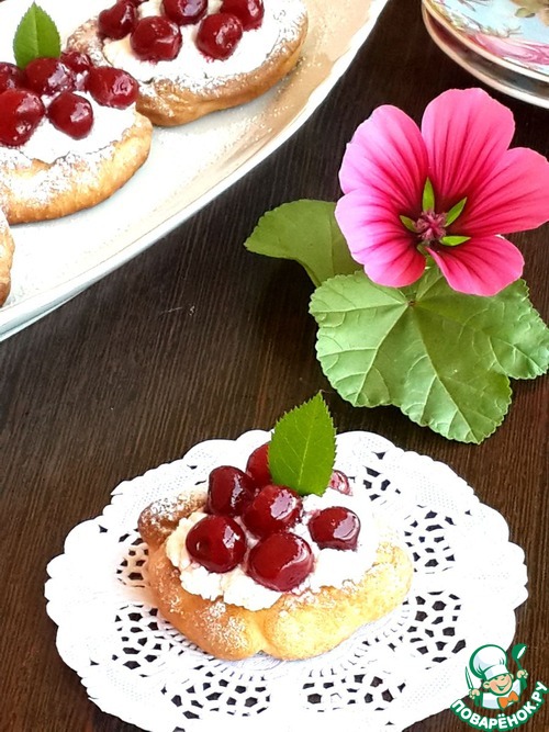 Сверху выложить ягоды вишни. Можно присыпать сахарной пудрой