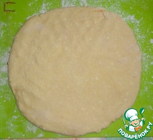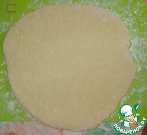 Тесто разделить на две части. Раскатываем первую часть и кладем на противень.