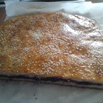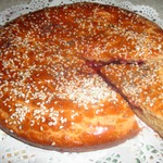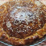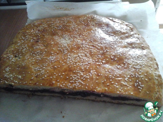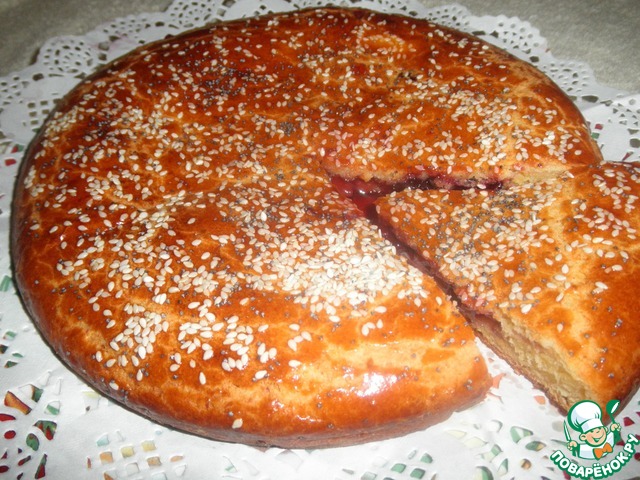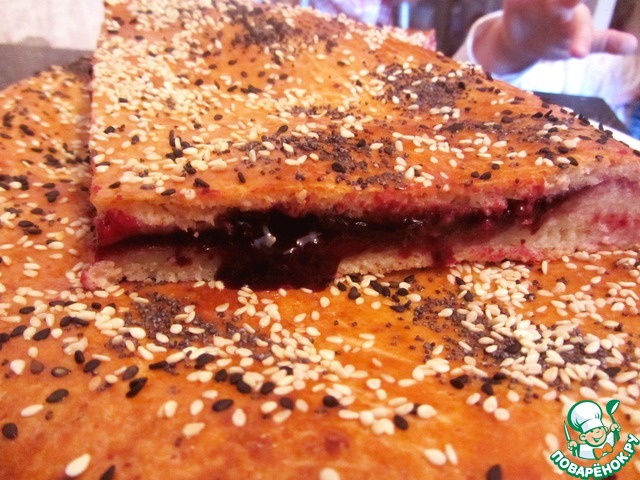 Сверху пирог смазываем яичным желтком. Посыпаем кунжутом и маком.