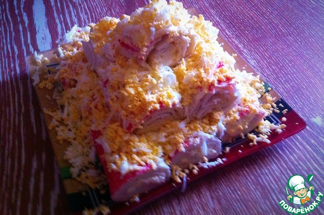 В первый слой - 4 палочки, второй - 3 палочки, затем 2 и 4 слой - 1 палочка. Каждый слой немножко смажте майонезом.