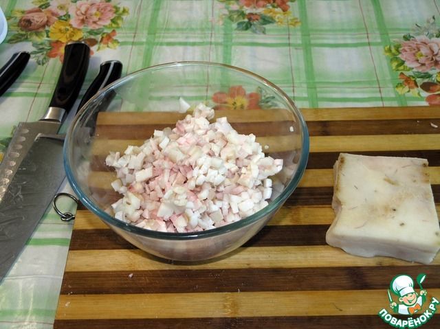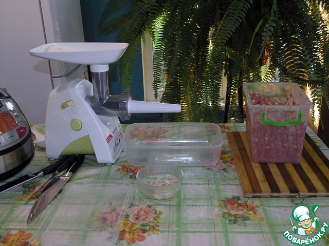 • За час до начала набивки оболочек фаршем: ставим воду и сало в морозильник для охлаждения.