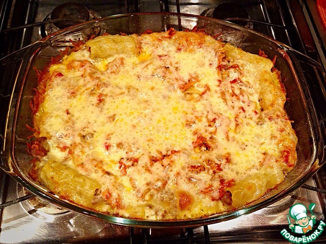 Все составляющие блюда готовы, можно приступит к сборке. А тут все просто. Берем макарошку и каждую наполняем фаршем. На дно формы для выпечки выкладываем равномерно часть соуса, и на него макароны.