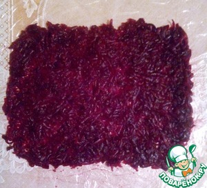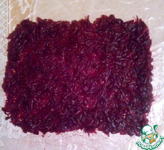 Расстилаем на столе пищевую пленку. натираем свеклу, выжимаем лишний сок. Распределяем по пищевой пленке не толстым слоем.