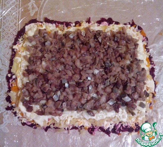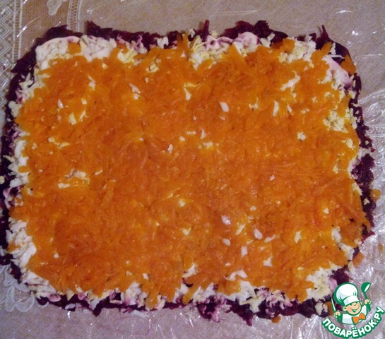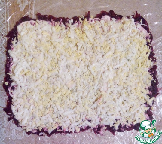 Промазываем майонезом. На свеклу трем на терке яйцо ( каждый слой после свеклы будет немного меньше по ширине и длине).