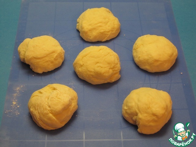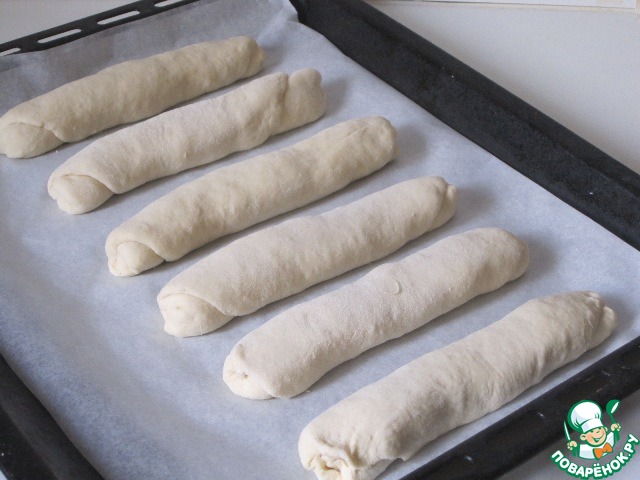 Так сформировать остальные 5 частей теста. Выложить на противень, выстланный бумагой для выпечки. Накрыть пленкой и оставить на 30 минут.