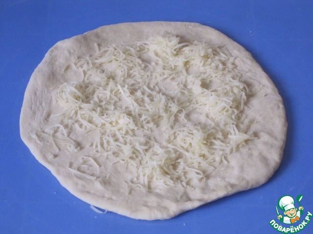 Смазать слегка взбитым желтком, сделать ножом надрезы, посыпать мелко натертым сыром.