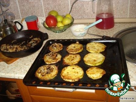 Приготовить начинку: грибы (если сухие, сначала, понятно, сварить) пережарить с луком. На противень выкладываем колечко кабачка, ложку начинки, дольку помидора. Заливаем майонезом с чесночком и посыпаем тертым сыром. На 15 мин. в духовку. И все! Гарнир на ваше усмотрение.