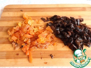 Теперь занимаемся начинкой - мелко нарезаем предварительно помытые чернослив и курагу. В оригинальном рецепте всё это измельчалось в блендере и делалась такая кашица (может это и лучше, но мне захотелось чтобы были кусочки)