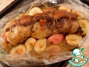 По истечении этого времени, вытягиваем аккуратно, чтобы не обжечься. Разрезаем рукав только сверху не до конца, что бы получилось "корытце". У меня получилось много жира, я немного ложкой выбрала. Порезала яблоки на 4 части, разложила вокруг рулета и поставила ещё на 20 минут (уж оооочень люблю я эти яблочки, запечённые с уткой).