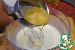 Влить растопленное и немного охлажденное сливочное масло, взбить. -