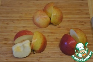 Яблоки разрезать на 4 части, очистить от кожицы и семенной коробочки, нарезать поперек на тонкие ломтики.