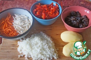 Морковь и корень сельдерея нашинковать тонкой соломкой, лук измельчить, болгарский перец нарезать лапшой. Грибы нарезать ломтиками.