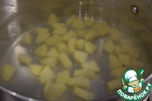 Воду довести до кипения, опустить нарезанный небольшими ломтиками картофель, довести до кипения и варить на маленьком огне 5 минут.