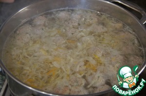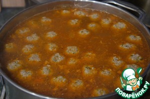 Убавить огонь таким образом, чтобы суп слегка кипел, и опустить в него фрикадельки. Снова довести суп до кипения и варить на маленьком огне 10 минут.