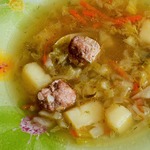 [+5]Делала часть фрикаделек из говядины,часть из курицы(небыло достаточно одного вида фарша). Куриные нам более понравились. Пришлось делать из неварёной перловки,т.к. отваренная пострадала в домашних катаклизмах. Просто варила суп дольше,получилось хорошо. Вместо аджики брала измельчонный острый перчик.