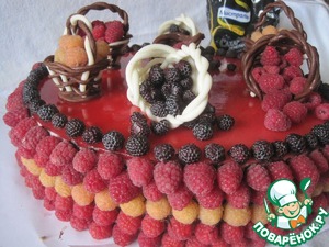 В корзинки кладем малину, несколько корзинок опрокидываем и малина из них вываливается на торт.