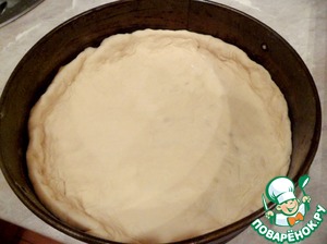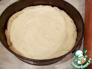 Одну половинку теста раскатать в тонкий блин и выложить, формируя бортики, в смазанную маслом форму.