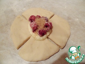 Делаем малиновые розочки. Каждый колобок раскатать и сделать по краям 4 надреза крест-накрест, не доходя до середины. В середину выложить чайную ложку творожной массы, на нее - малину, и сверху присыпаем коричневым сахаром Демерара ТМ «Мистраль».