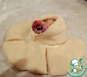 Каждой четвертинкой теста оборачиваем начинку и защипываем. Формируются бутончики.