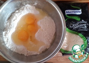 Для блинов просеять муку, смешать её с коричневым сахаром ( я использовала сахар ТМ "Мистраль") и солью, добавить яйца