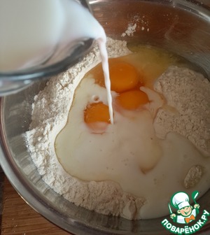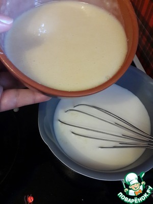 Вливая постепенно молоко, размешивать массу венчиком, чтобы не было комков