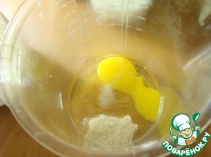 Кладём туда же сахар, соль, яйца и перемешиваем венчиком, чуть подвзбивая.