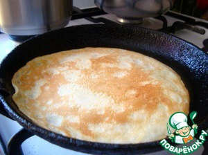 Начинаем выпекать. Подмазываем раскалённую сковороду только один раз-первый. В тесто мы добавили масло, блины отлично выпекутся без подмазки.