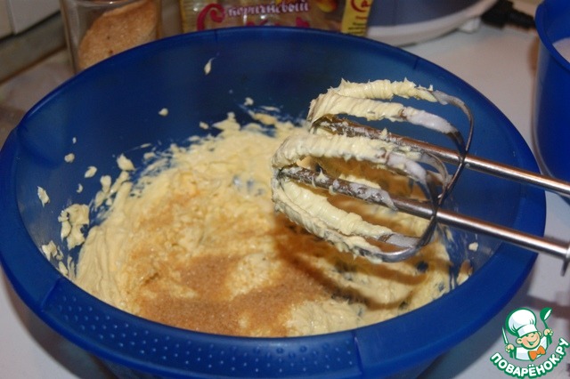 Просеять вместе муку, крахмал, разрыхлитель и соль. Масло комнатной температуры взбить до пышной пены, не переставая взбивать ввести 300 г тростникового сахара, взбивать 5-7 минут.