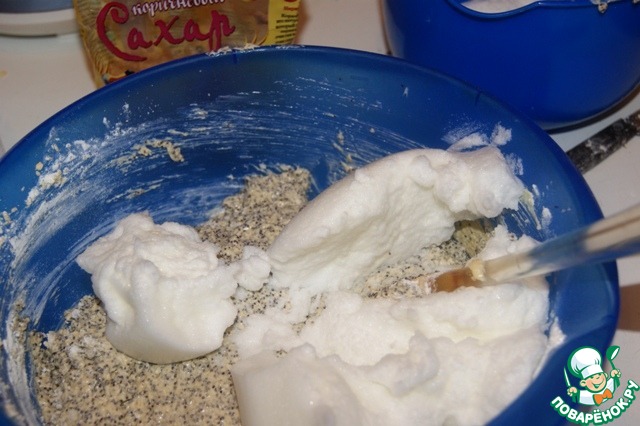 Белки взбить до устойчивых пиков. Поочередно в 3 приема ввести в маковую смесь муку и белки, перемешивая лопаточкой снизу вверх и по кругу.