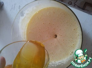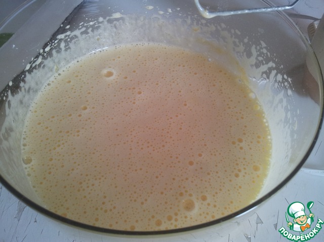 • Яйца взбить в пену. Добавить соль, сахар и ванильный сахар, взбить до пышной массы.