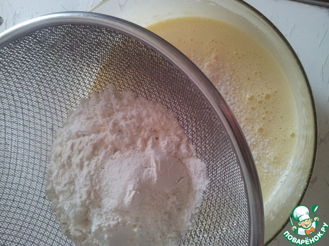 • В последнюю очередь просеять в яичную массу муку смешанную с разрыхлителем и крахмалом. Тесто вылить в смазанную форму. Выпекать в горячей духовке при t-180* 30 минут до готовности.